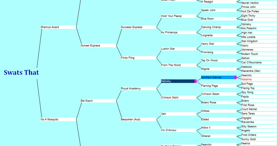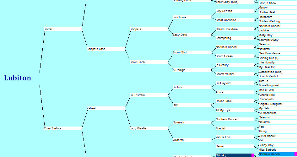 When mated with these mares, two line breeding patterns appear the double of Nijinsky himself and also the mare Natalma, dam of his sire Northern Dancer.